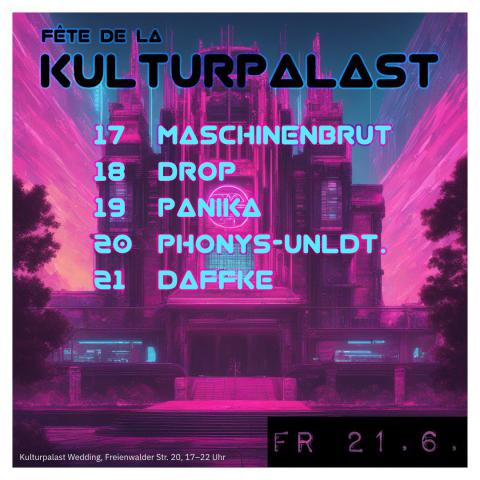 Maschinenbrut spielt zusammen mit: Drop, Panika, Phonys-unldt. und Daffke am Freitag den 21.6.2024 (17-22 Uhr) im Kulturpalast Wedding, (Freienwalder Str. 20 -> https://kulturpalastwedding.wordpress.com/)